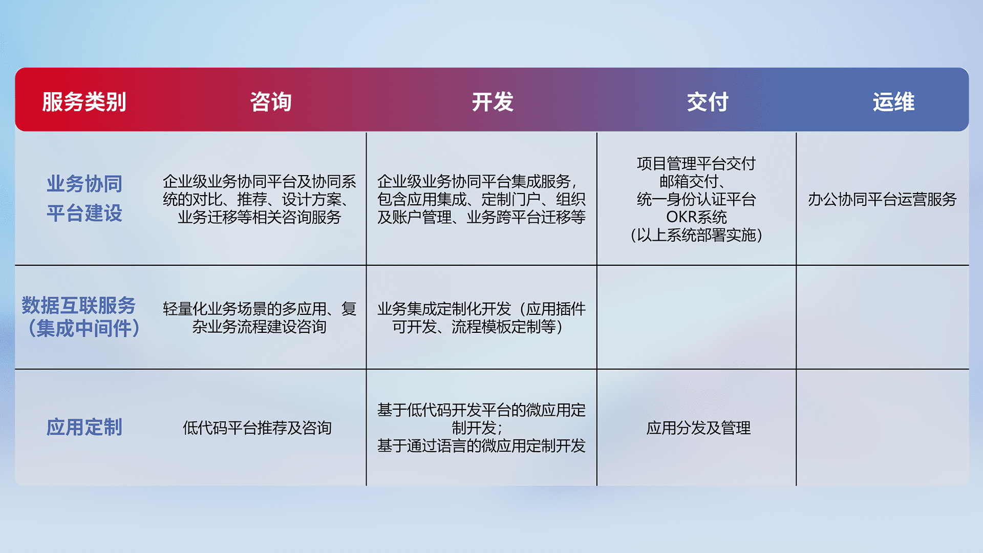 针对钉钉、、、企微、、IDaas等平台级产品提供产品的规划、、、、方案、、交付、、定制化开发等服务,,,实现如统一协同办公、、、、智能客户服务、、、、混合会议管理、、、、智能数据查询、、、等业务场景,,,实现数字化转型。。